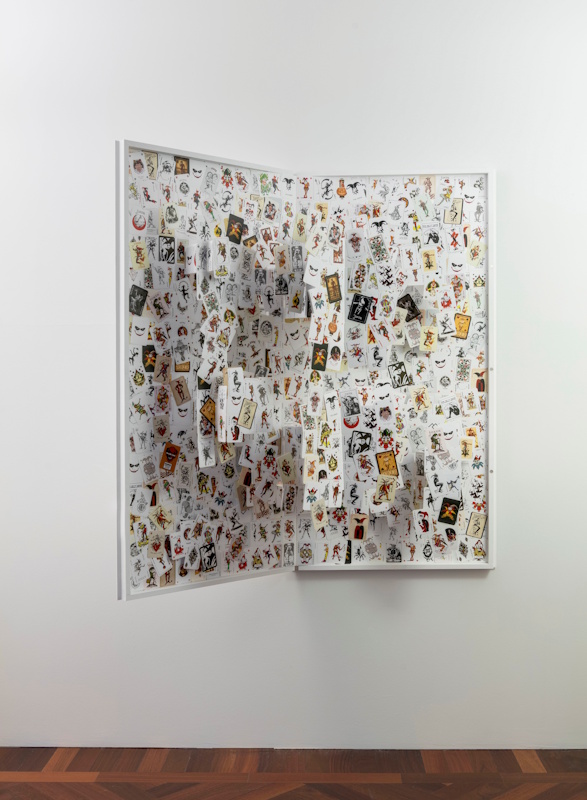Nelle opere prodotte per l’occasione, My Little White Book, un grande libro a parete che sembra esplodere dall’interno, e nella scultura totemica dal titolo Endsong, Tranquilli utilizza materiali che suggeriscono il principio di precarietà, come la carta da gioco, ricostruendo elementi che, al contrario, evocano atemporalità e monumentalità. Nella mostra c’è un’eco dell’immaginario di Stanley Kubrick, in particolare il monolite di 2001: Odissea nello Spazio, e di David Lynch. Ancora una volta, il linguaggio musicale, fondamentale nella ricerca dell’artista, è elemento centrale del progetto espositivo, realizzato per l’occasione.