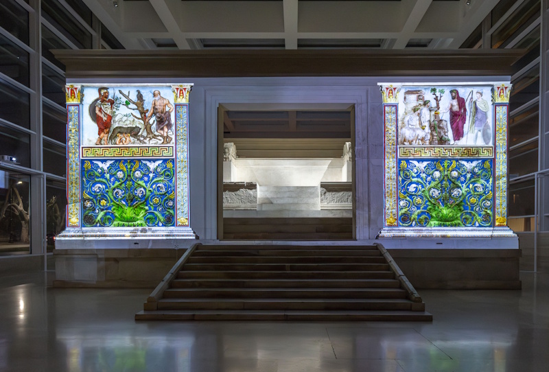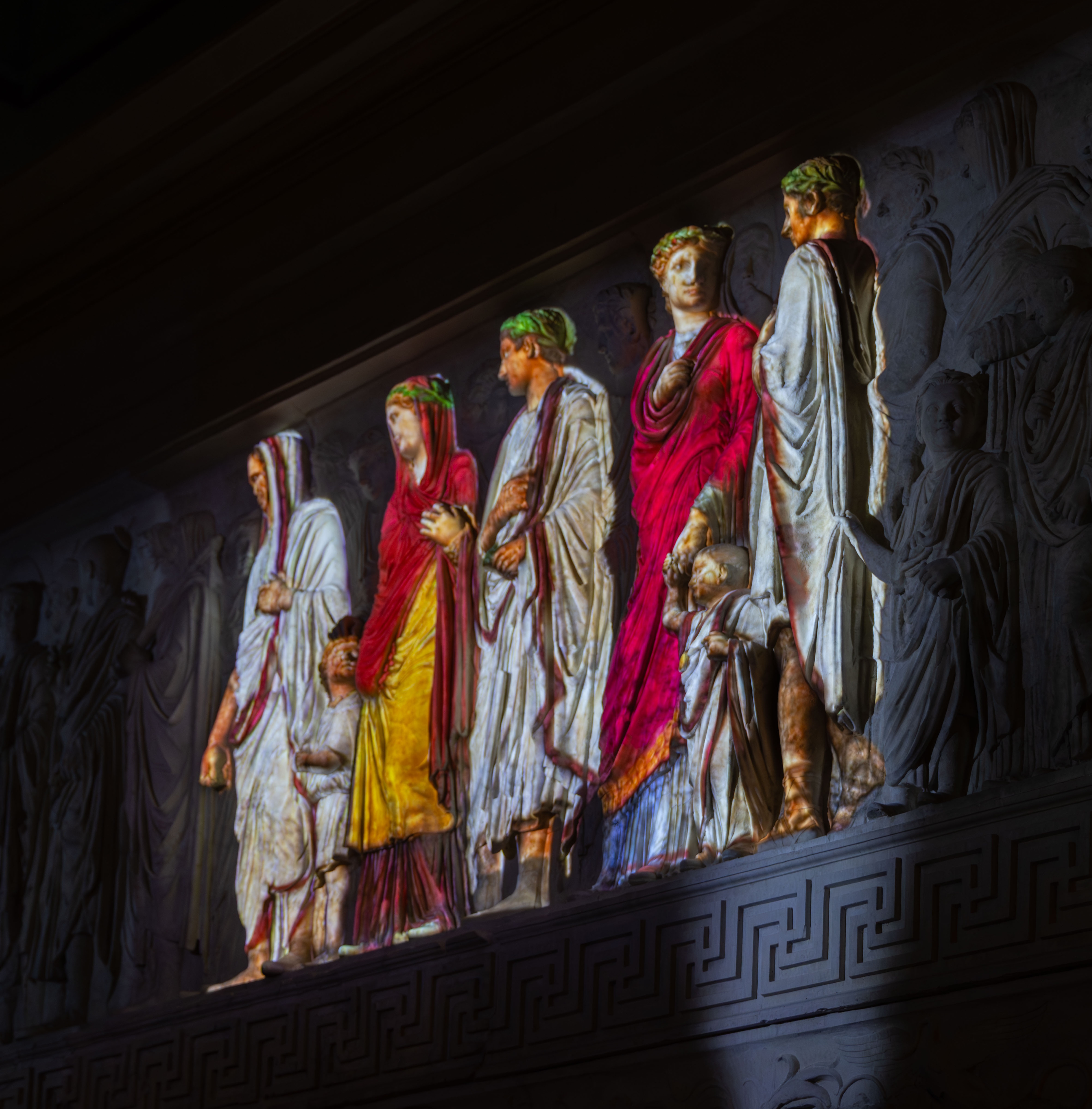 Sull’ipotesi della colorazione originaria dell’Ara Pacis ha lavorato negli anni passati un gruppo di studio nato in occasione dell’allestimento del nuovo Museo. In particolare, è stato approntato un modello tridimensionale dell’altare sul quale è stata applicata la restituzione del colore secondo criteri filologici e storico-stilistici. Dal modello è nata l’idea di proiettare direttamente sulle superfici in marmo dell’altare raggi di luce colorata per ricreare, in via d’ipotesi, l’aspetto totale e realistico prossimo alla policromia originaria.